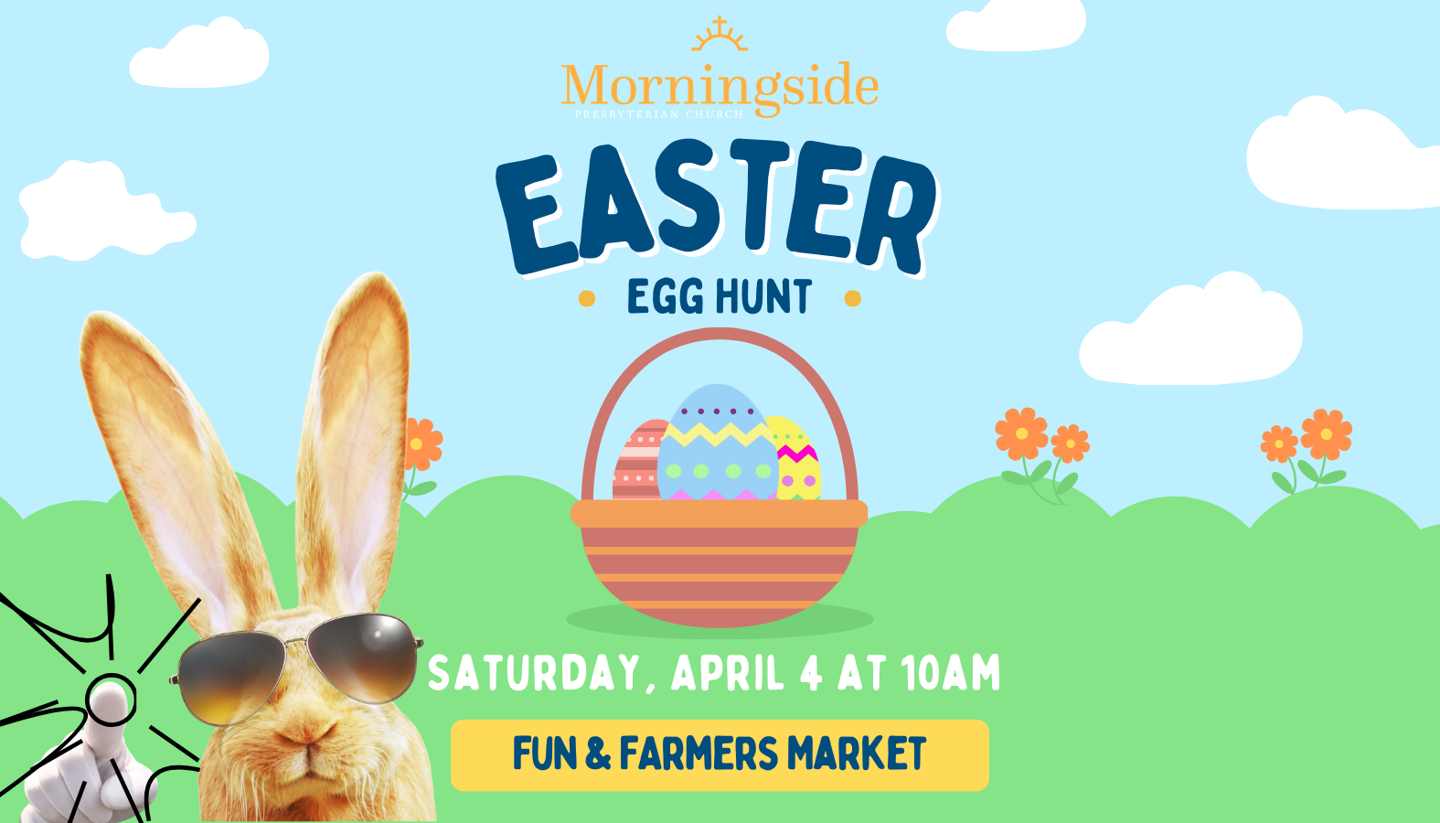 The Annual MPC Easter Egg Hunt returns on Saturday, April 4, and we welcome all families, friends, and neighbors! The egg hunt starts promptly at 10, so arrive early and visit our friends at the Morningside Farmers Market. Reach out to Pastor Kim Rubish with any questions. We can't wait to see you there!"