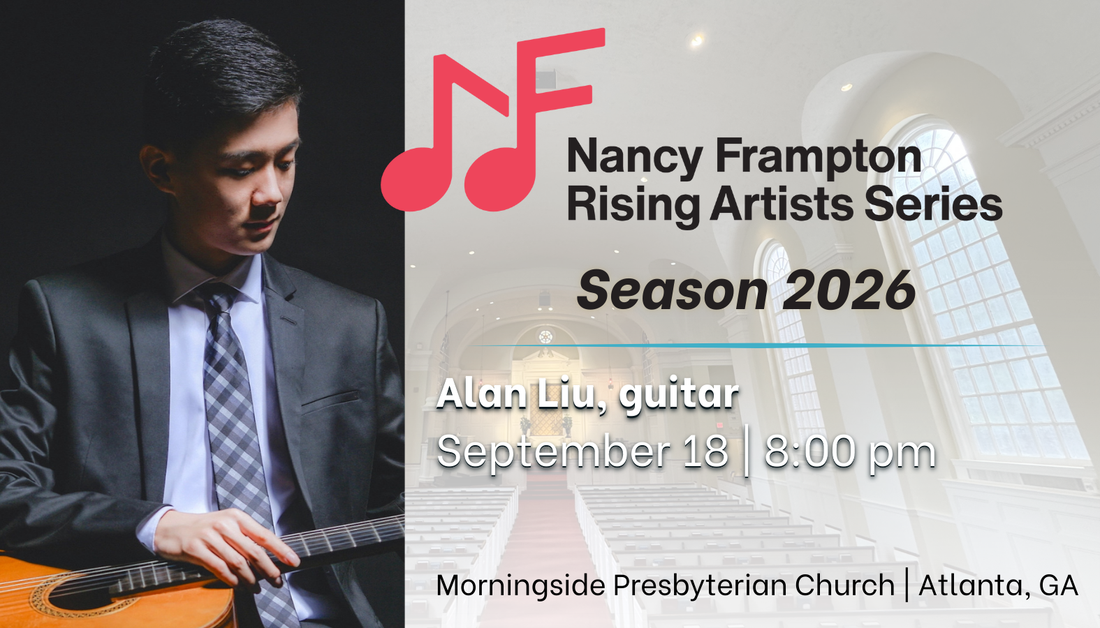 The Nancy Frampton Rising Artists Series at Morningside Presbyterian Church celebrates the spirit and ethos of music. By providing a vibrant platform for emerging preeminent musicians, many with ties to Atlanta and Georgia, NFRAS serves as a bridge to connect rising artists and audiences through outstanding performances that unite, uplift, and transcend in an exceptional acoustic setting. Dedicated to the memory of late arts enthusiast Nancy Walker Frampton, this series continues her passionate legacy for music and the arts.